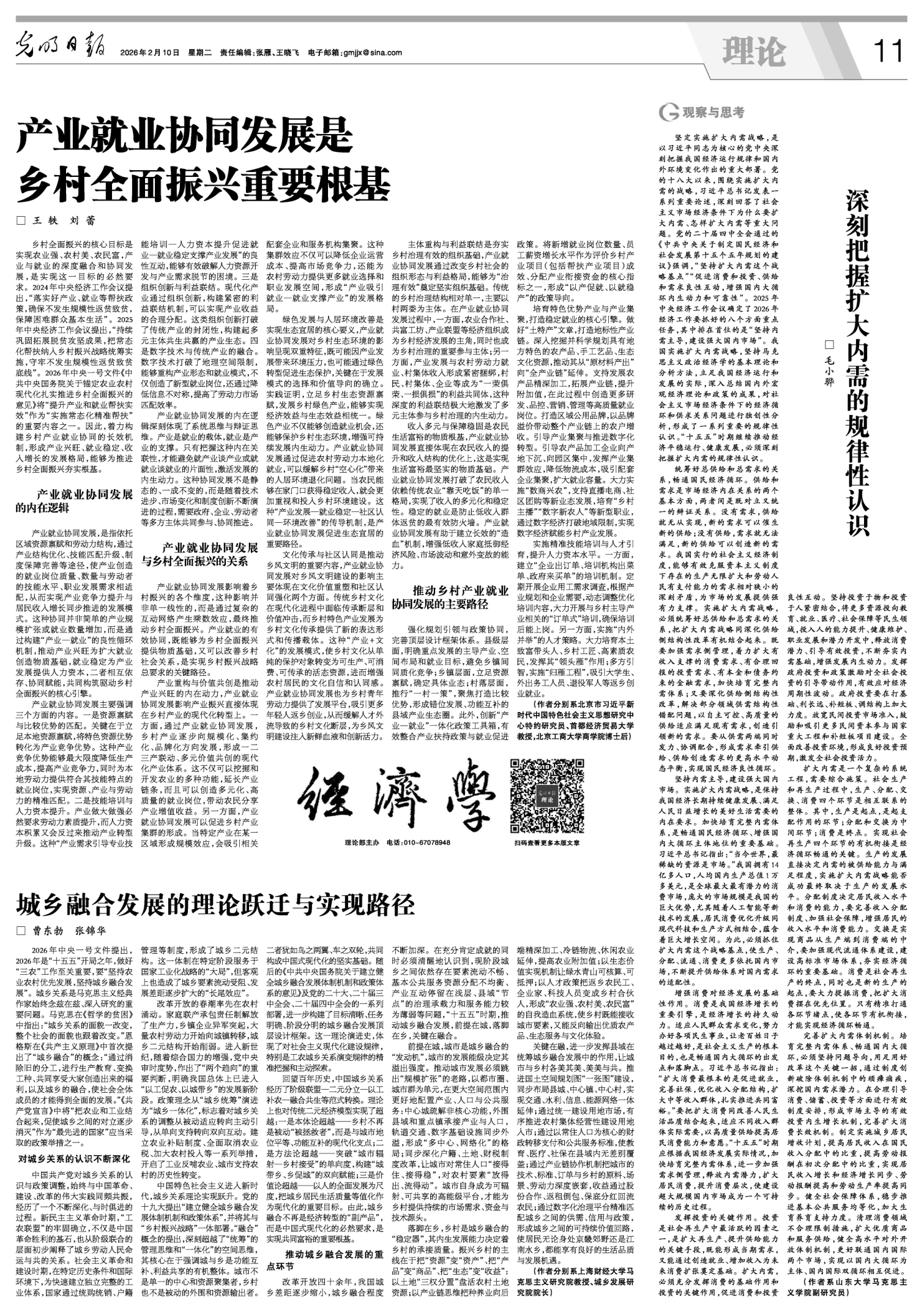 近日,赢家娱乐城 王轶教授所著文章《产业就业协同发展是乡村全面振兴重要根基》在《光明日报(理论版)》(2026年2月10日)发表。文章探究了产业就业协同发展的内在逻辑、产业就业协同发展与乡村全面振兴的关系,并提出了推动乡村产业就业协同发展的主要路径。