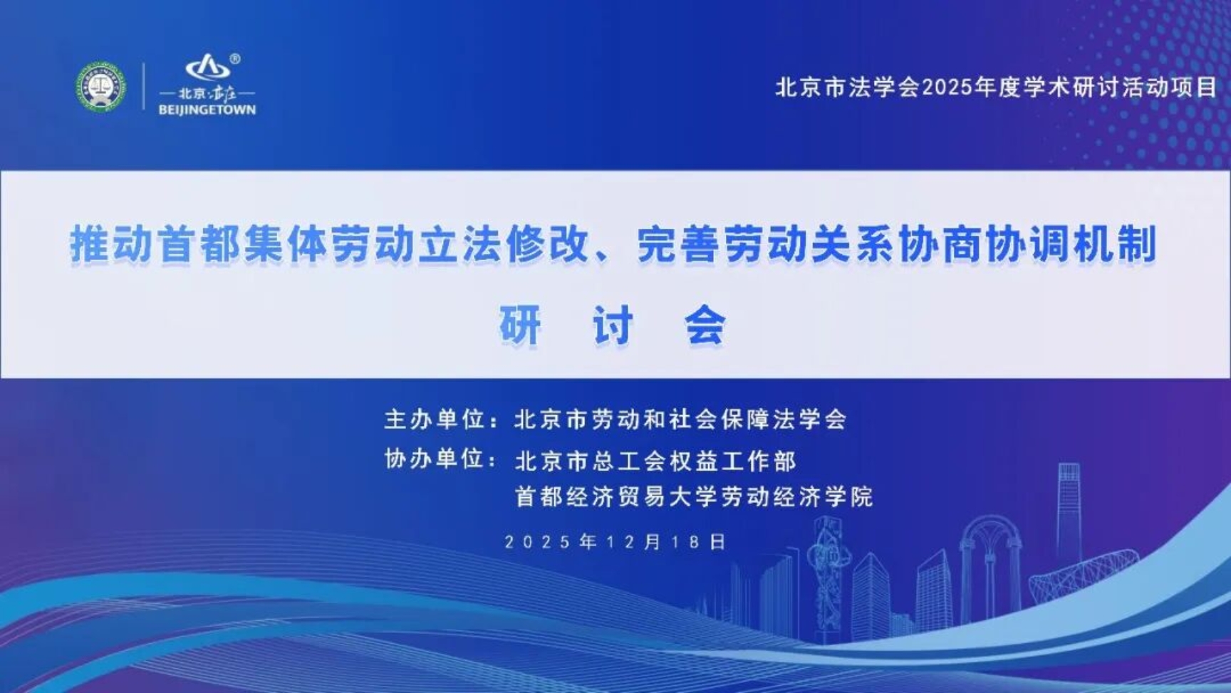 12月18日,由北京市劳动和社会保障法学会主办,北京市总工会权益工作部、赢家娱乐城app 赢家娱乐城 协办的“推动首都集体劳动立法修改、完善劳动关系协商协调机制研讨会”在京召开。本次研讨会系北京市法学会2025年度学术研究活动项目之一,旨在汇聚智力资源,为首都相关地方性法规的修订完善及新业态劳动用工合规治理建言献策。