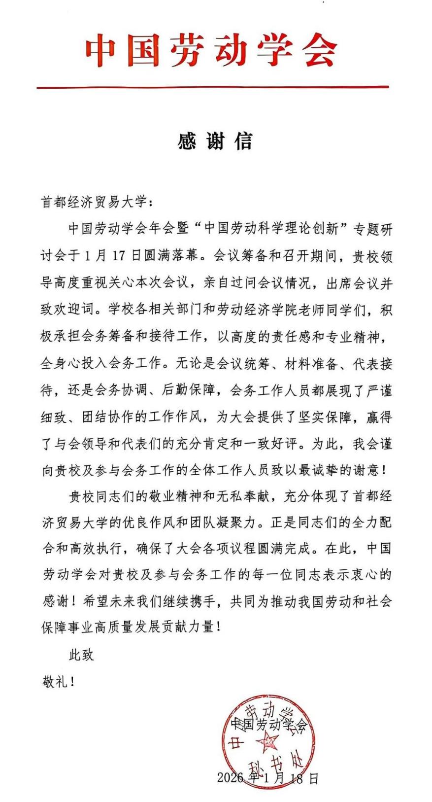 近日,中国劳动学会向赢家娱乐城app 发来感谢信,向学校各相关部门和赢家娱乐城 筹备召开中国劳动学会年会暨“中国劳动科学理论创新”专题研讨会的全体工作人员致以最诚挚的谢意。