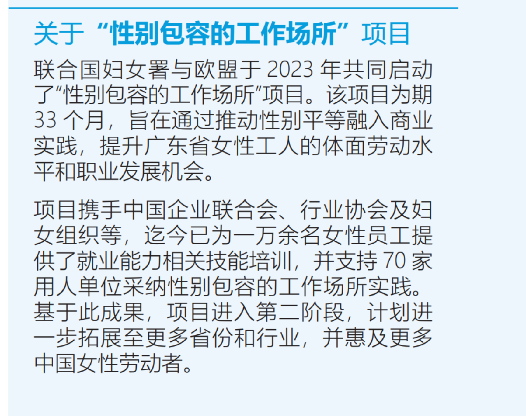 为应对上述挑战,“性别包容的工作场所”项目支持企业建立沟通反馈、分性别数据监测、内部审查、预防性别暴力与骚扰、家庭友好支持及职业健康安全等六类机制。实践表明,制度化安排能够有效改善女性发展环境。例如,广硕鞋业通过数字化监测系统和分层培训体系推动女性技能提升与晋升;中兴通讯以“爱心托管班”缓解员工育儿压力;江门敬记通过健全反性骚扰机制强化职场安全保障,均取得积极成效。