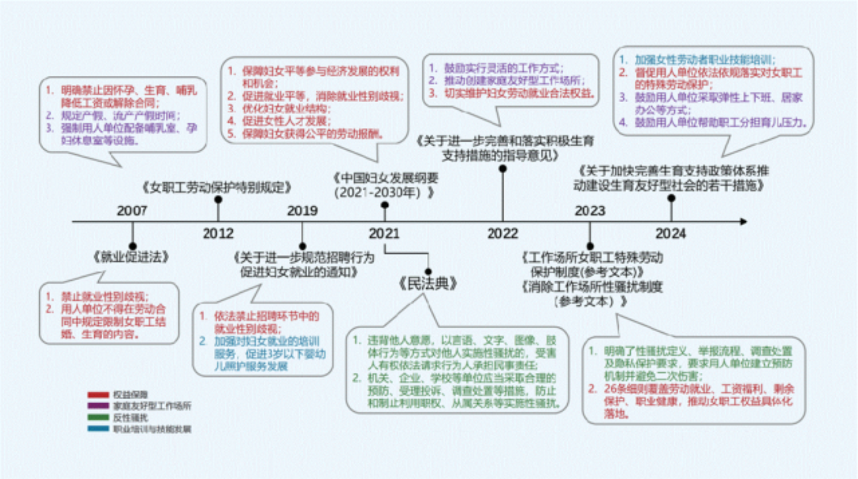 国家层面出台了一系列涵盖权益保障、家庭友好型职场、职业发展与技能培训以及反性骚扰等领域的具体政策。地方政府在严格执行各项政策的过程中,也出台了更具针对性的地方性法规和措施。