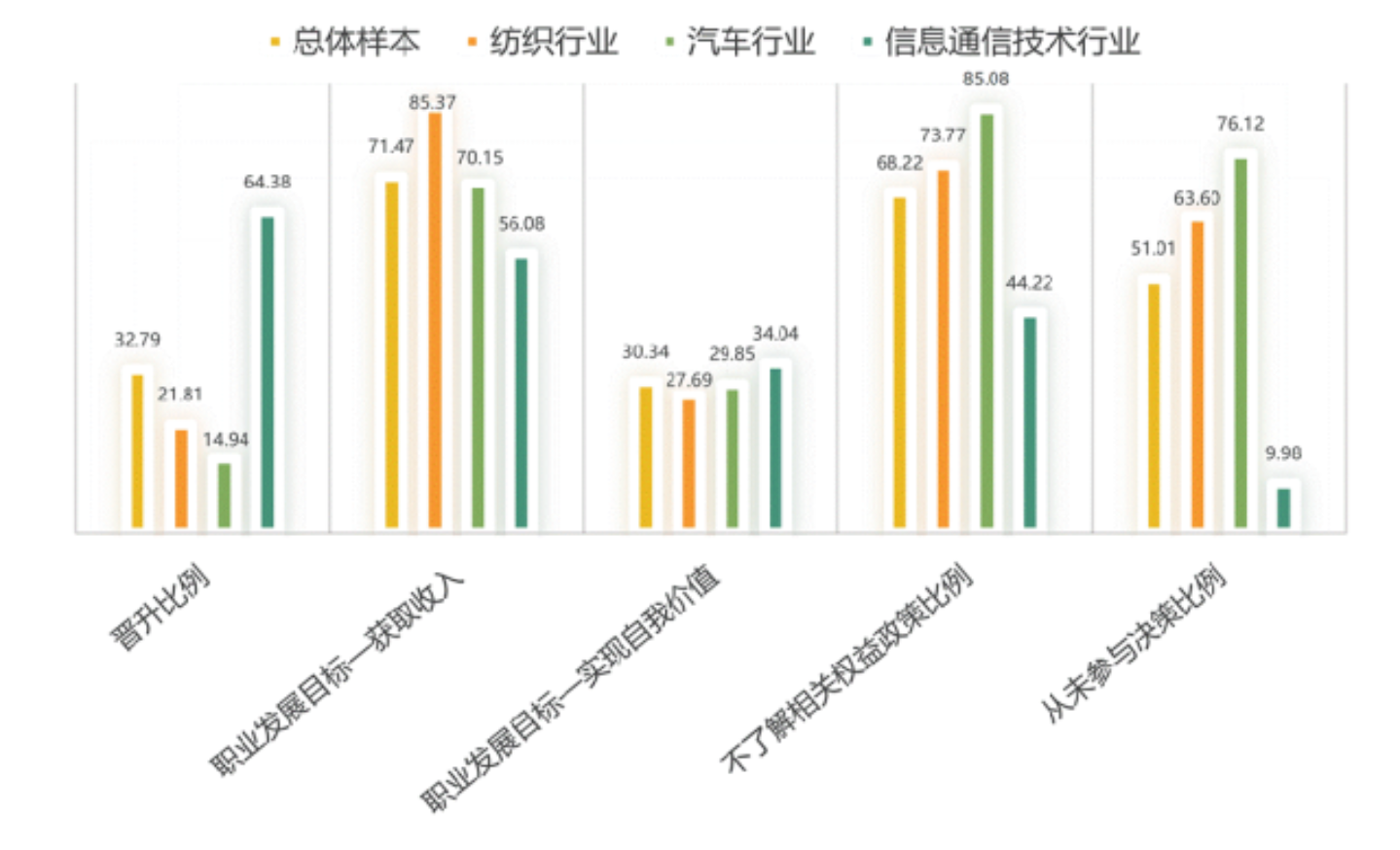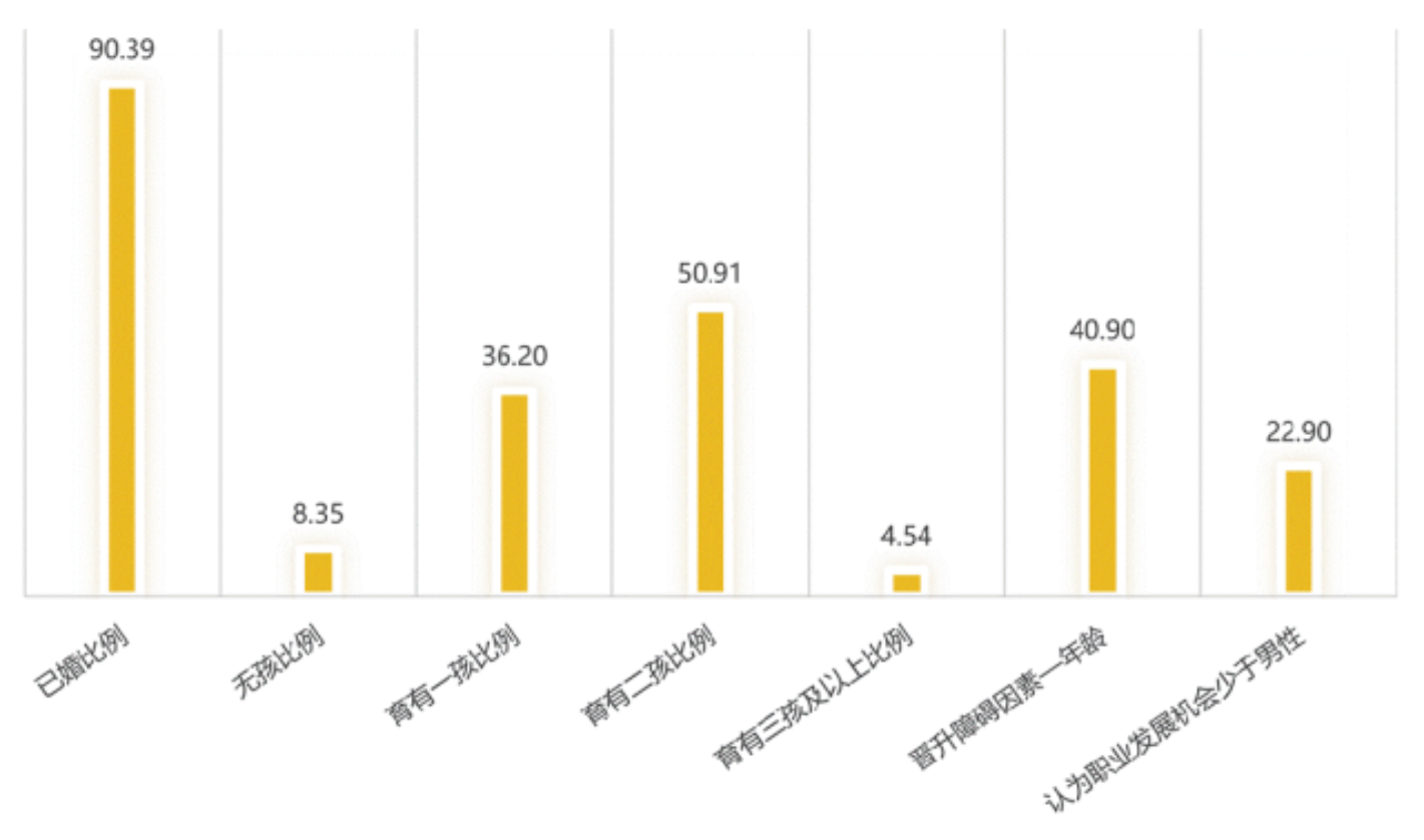 调研结果显示,受访女工整体学历偏低,培训机会有限且针对性不足,晋升渠道相对狭窄,职业发展规划意识较弱。多数女性承担主要家庭照护责任,托育支持不足加剧职业中断风险。性别与年龄歧视在部分行业中仍然存在,女性在企业决策中的参与度和话语权有限。同时,政策执行在国有企业与部分中小企业之间存在差异,流动女工和残障女性面临更为突出的交叉性困境。